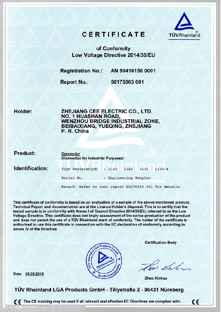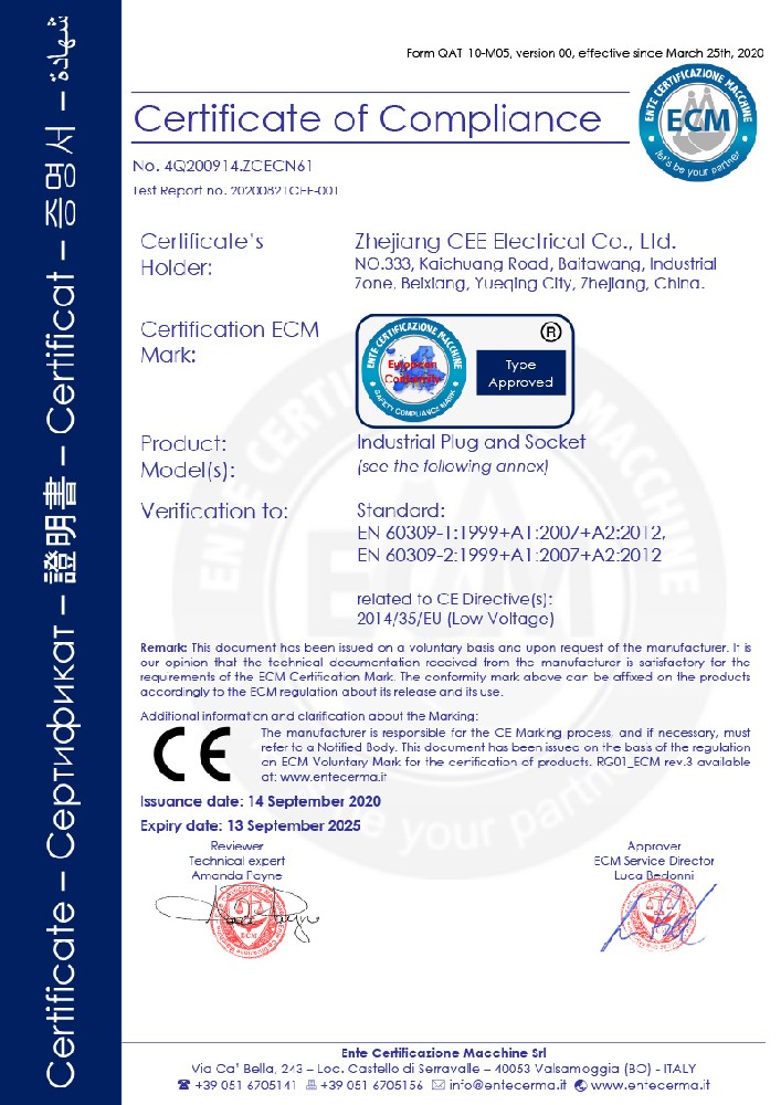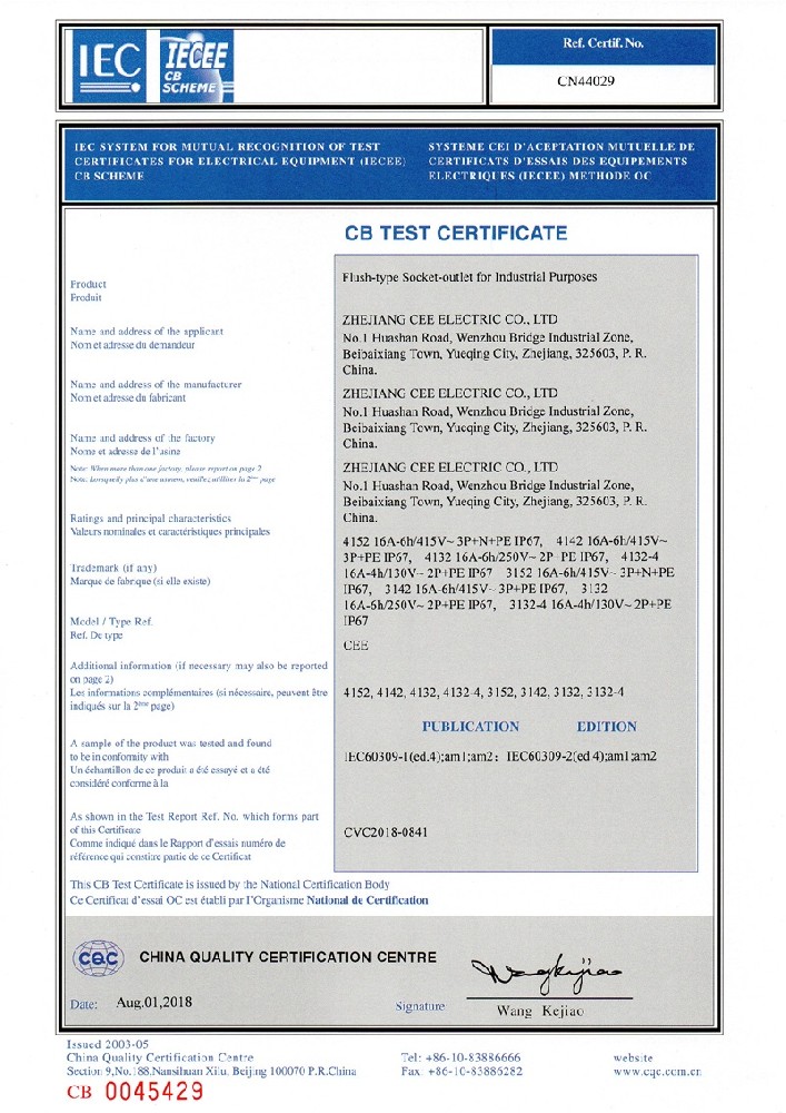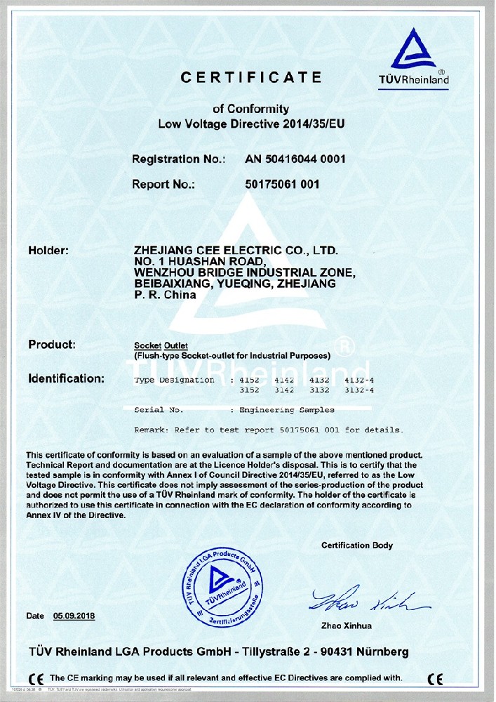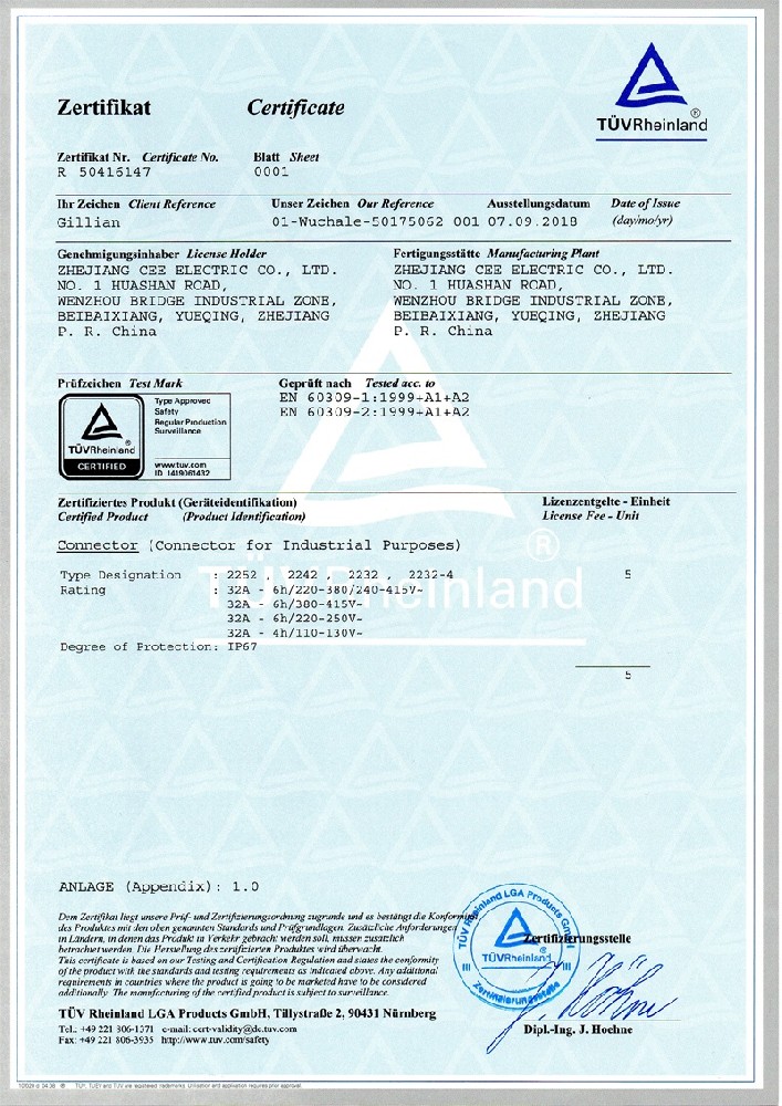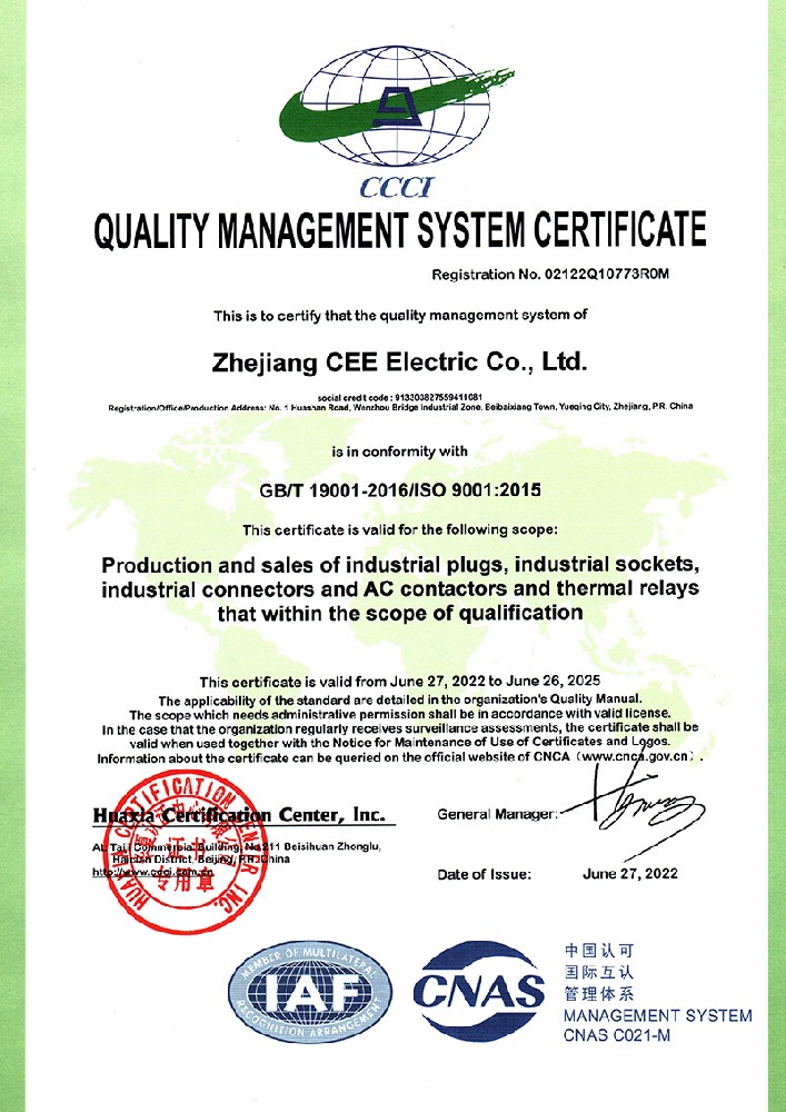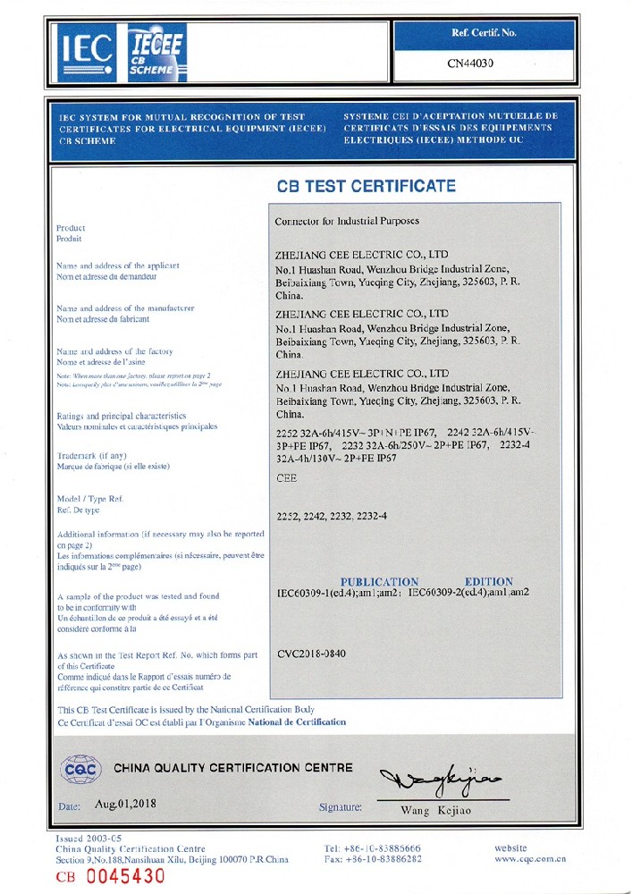 公司全面貫徹實(shí)施IS09001:2015質(zhì)量管理體系認(rèn)證。工業(yè)插頭插座符合IEC 603 09-1-2, EN 60 309-1-2國際標(biāo)準(zhǔn), 組合插座箱符合EN61439標(biāo)準(zhǔn),并通過Intertek & TUV Rheinland & CQC等認(rèn)證。證書包括TUV、SEMKO、CE、CB、EAC,并符合RoHS和Reach等適用法規(guī)。公司引進(jìn)先進(jìn)生產(chǎn)設(shè)備和精密檢測試驗(yàn)儀器、不斷引入高科技工藝流程和技術(shù)人才,為公司的產(chǎn)品研發(fā)、質(zhì)量升級、管理創(chuàng)新提供了強(qiáng)有力的保障。公司將持續(xù)以優(yōu)質(zhì)的產(chǎn)品和服務(wù),贏得客戶的最大滿意為宗旨,發(fā)揚(yáng)“創(chuàng)新、服務(wù)、溝通”的企業(yè)精神,力促CEE品牌從中國走向世界。我們牢牢把握時代賦予的使命和機(jī)遇,與海內(nèi)外合作伙伴共同開創(chuàng)事業(yè)的新高度。