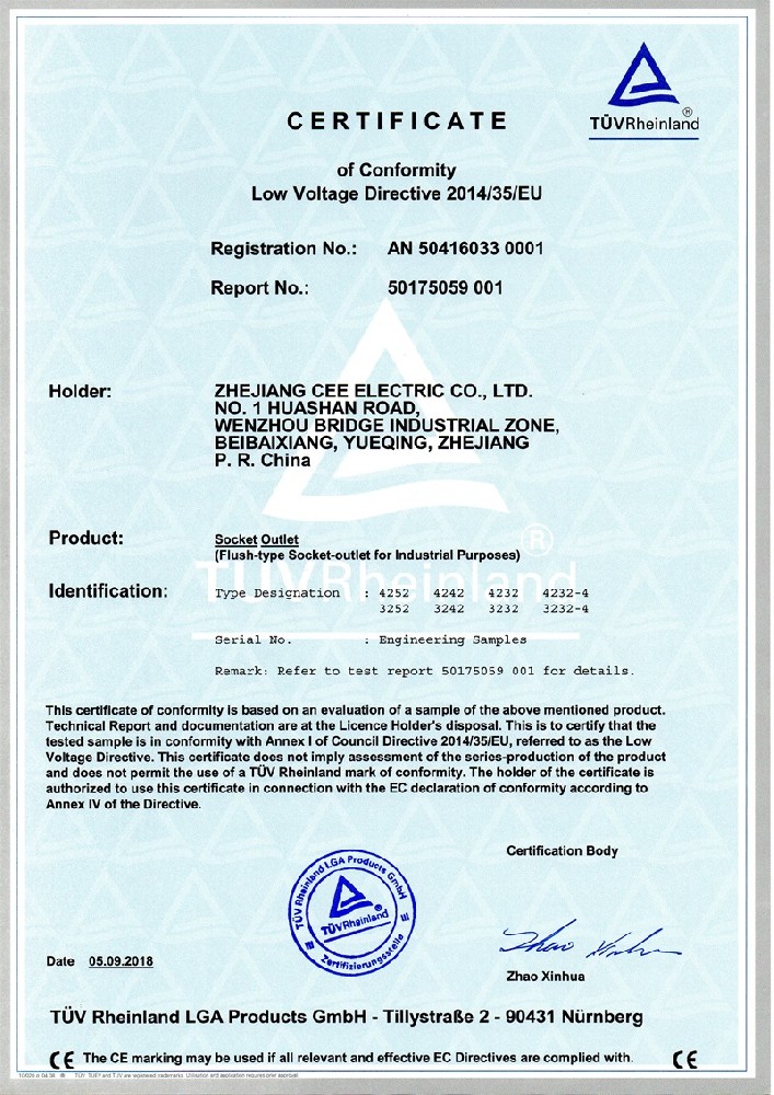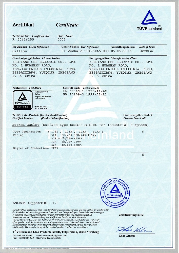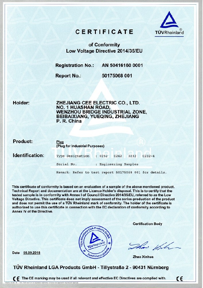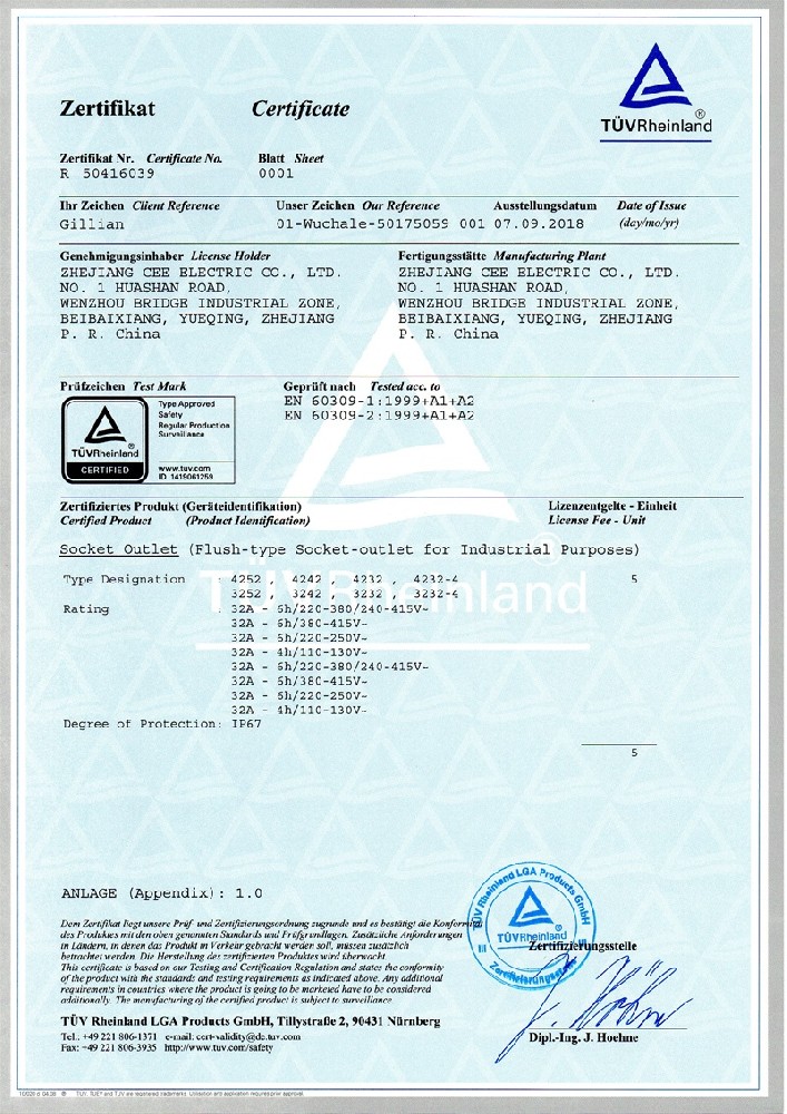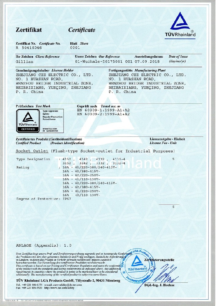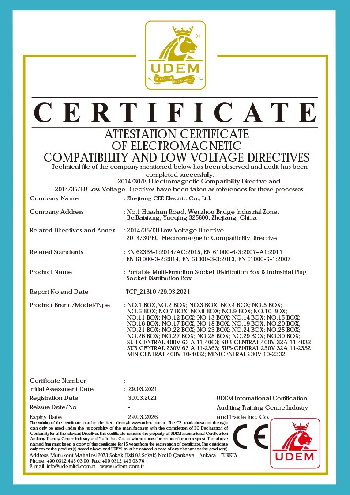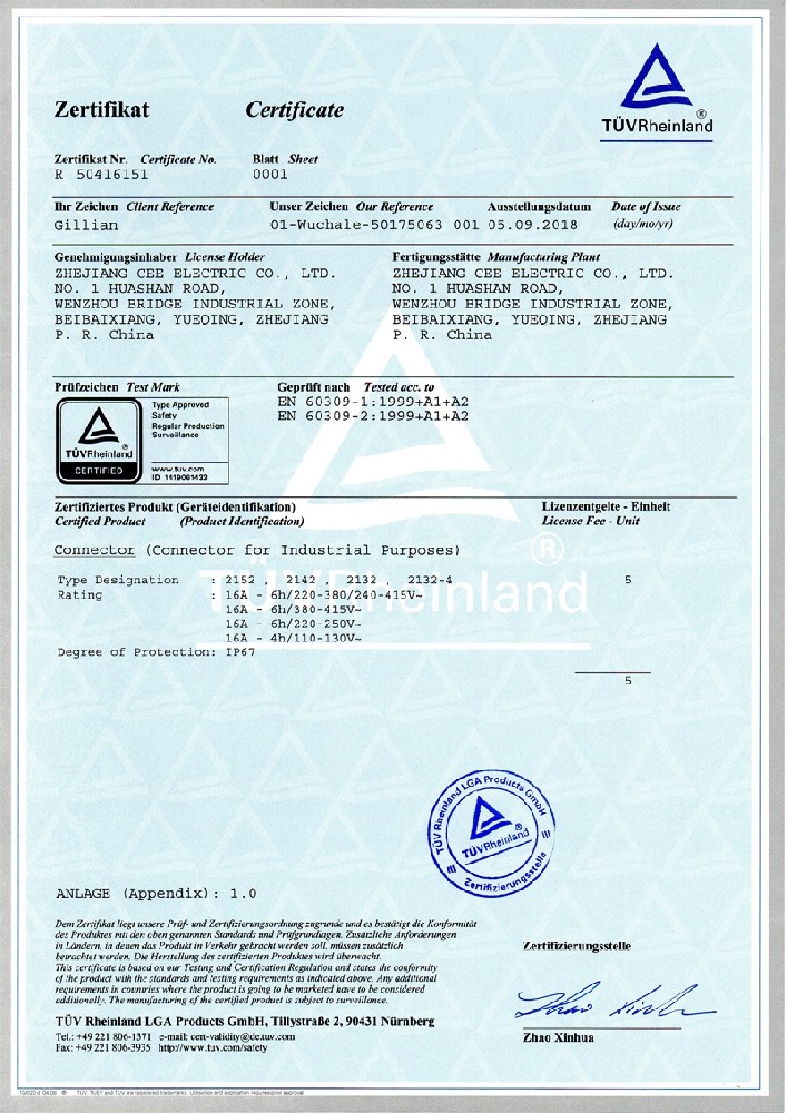公司全面貫徹實(shí)施IS09001:2015質(zhì)量管理體系認(rèn)證。工業(yè)插頭插座符合IEC 603 09-1-2, EN 60 309-1-2國際標(biāo)準(zhǔn), 組合插座箱符合EN61439標(biāo)準(zhǔn),并通過Intertek & TUV Rheinland & CQC等認(rèn)證。證書包括TUV、SEMKO、CE、CB、EAC,并符合RoHS和Reach等適用法規(guī)。公司引進(jìn)先進(jìn)生產(chǎn)設(shè)備和精密檢測試驗(yàn)儀器、不斷引入高科技工藝流程和技術(shù)人才,為公司的產(chǎn)品研發(fā)、質(zhì)量升級、管理創(chuàng)新提供了強(qiáng)有力的保障。公司將持續(xù)以優(yōu)質(zhì)的產(chǎn)品和服務(wù),贏得客戶的最大滿意為宗旨,發(fā)揚(yáng)“創(chuàng)新、服務(wù)、溝通”的企業(yè)精神,力促CEE品牌從中國走向世界。我們牢牢把握時代賦予的使命和機(jī)遇,與海內(nèi)外合作伙伴共同開創(chuàng)事業(yè)的新高度。