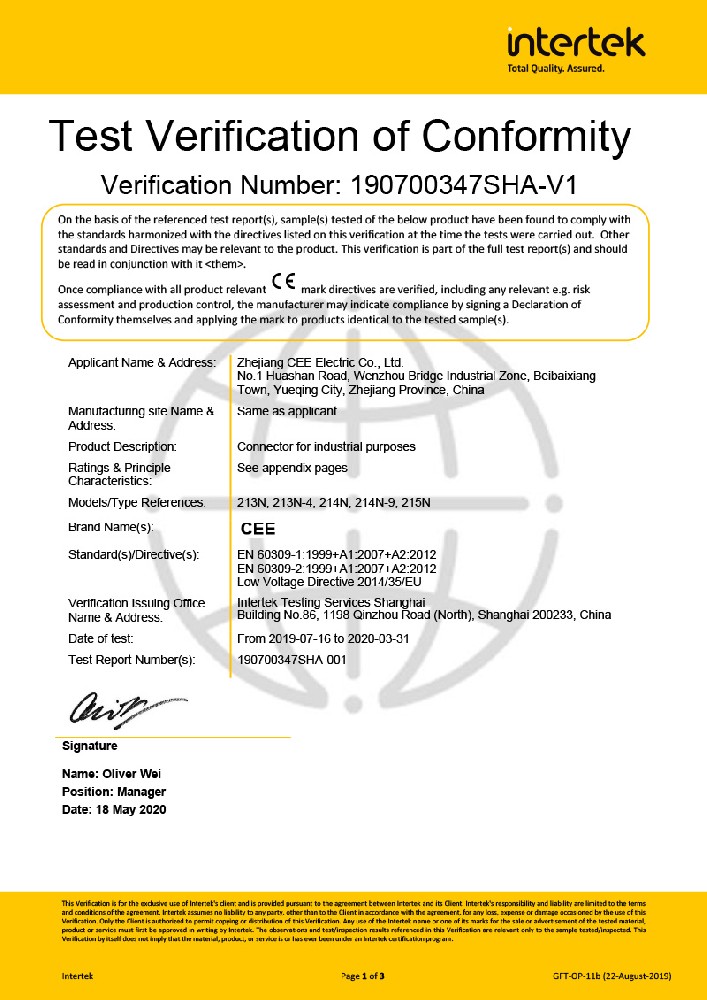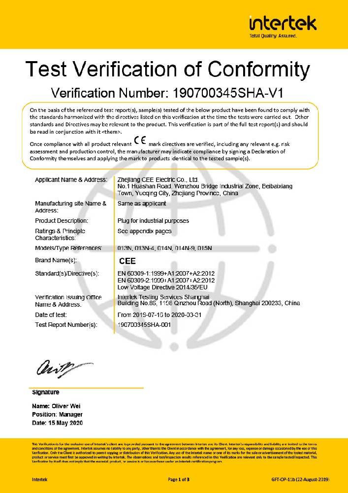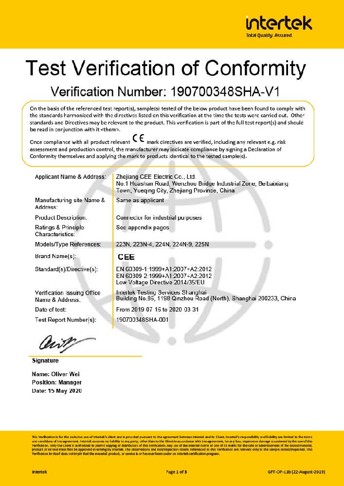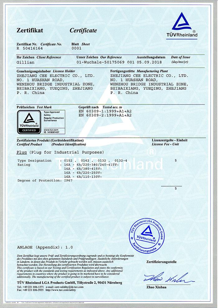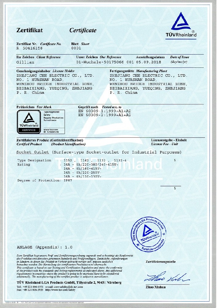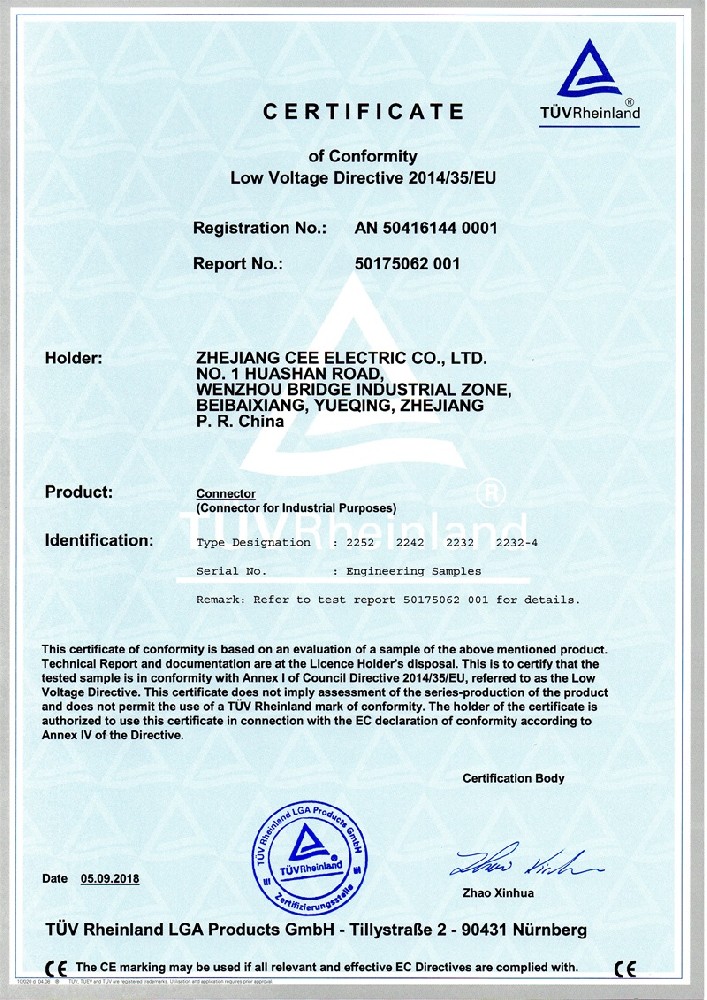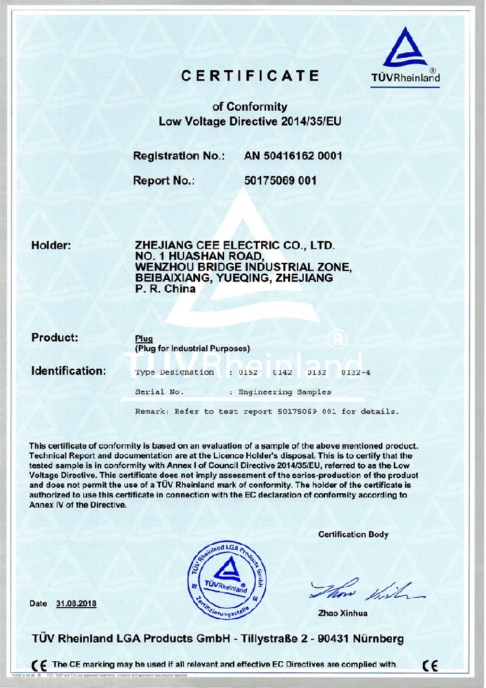 公司全面貫徹實(shí)施IS09001:2015質(zhì)量管理體系認(rèn)證。工業(yè)插頭插座符合IEC 603 09-1-2, EN 60 309-1-2國際標(biāo)準(zhǔn), 組合插座箱符合EN61439標(biāo)準(zhǔn),并通過Intertek & TUV Rheinland & CQC等認(rèn)證。證書包括TUV、SEMKO、CE、CB、EAC,并符合RoHS和Reach等適用法規(guī)。公司引進(jìn)先進(jìn)生產(chǎn)設(shè)備和精密檢測試驗(yàn)儀器、不斷引入高科技工藝流程和技術(shù)人才,為公司的產(chǎn)品研發(fā)、質(zhì)量升級、管理創(chuàng)新提供了強(qiáng)有力的保障。公司將持續(xù)以優(yōu)質(zhì)的產(chǎn)品和服務(wù),贏得客戶的最大滿意為宗旨,發(fā)揚(yáng)“創(chuàng)新、服務(wù)、溝通”的企業(yè)精神,力促CEE品牌從中國走向世界。我們牢牢把握時代賦予的使命和機(jī)遇,與海內(nèi)外合作伙伴共同開創(chuàng)事業(yè)的新高度。